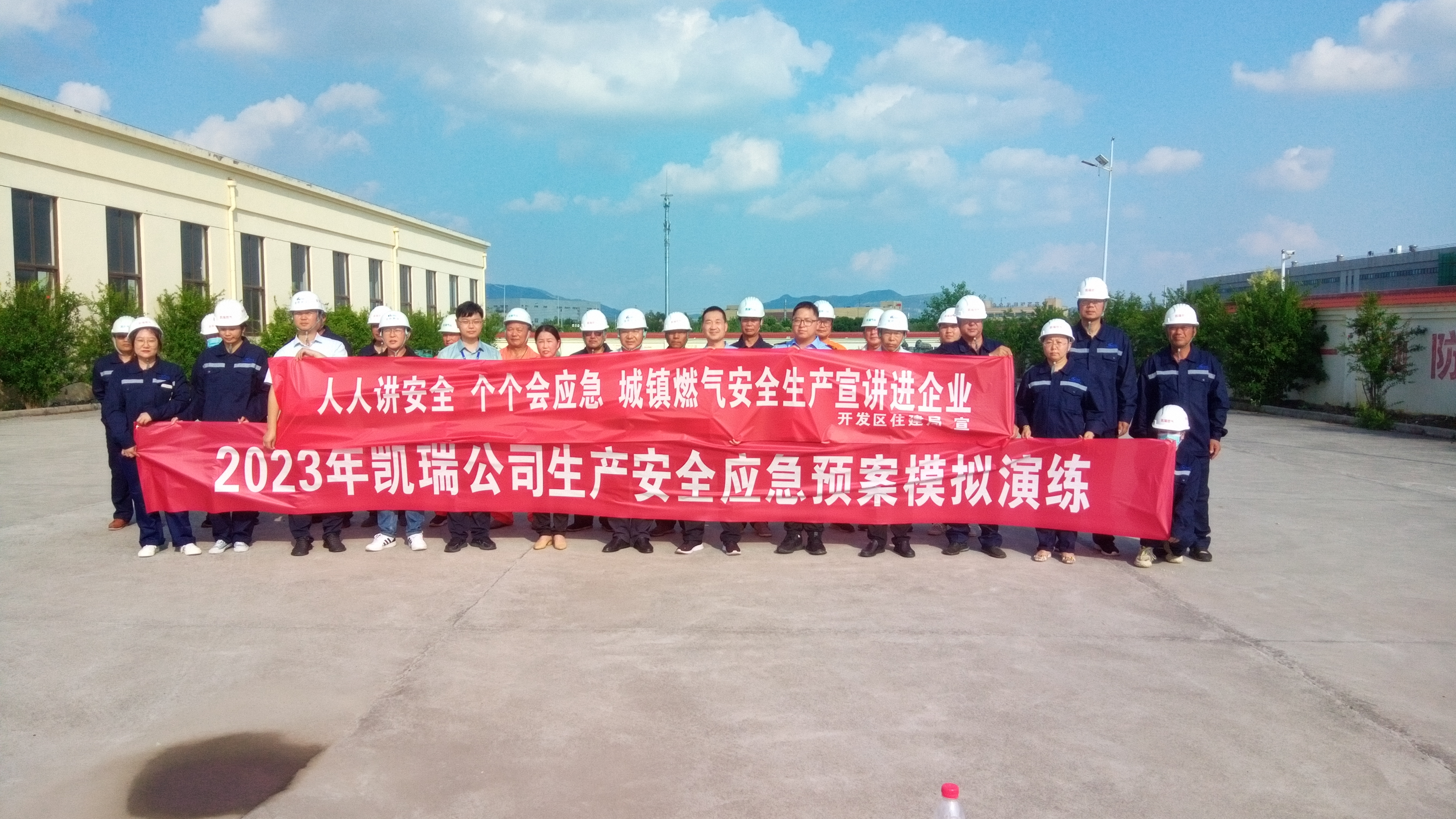 随着口令发出,演练正式开始:现场模拟液化石油气气瓶在装车过程中,押运人员发现已装上配送车辆的气瓶角阀部位有漏气现象。经初步关闭操作,无法起到关闭效果,大量液化石油气泄露后,引发火灾事故。押运人员发现事故后迅速上报,应急指挥部接报告后立即启动应急响应,应急小组分工实施抢险救援,迅速开展人群疏散管控、堵漏、灭火、环境监测等工作,经过半小时的救援,成功地排除了险情。现场出动抢险车1台,液化石油气瓶运输车1台,凯瑞公司抢险处置人员20余名,共成立演练总指挥、现场指挥、物资供应、抢修救援、现场处置、医疗救护、专家点评7个小组。演练过程紧张有序,参演人员反应迅速规范,具有很强的针对性与指导性。