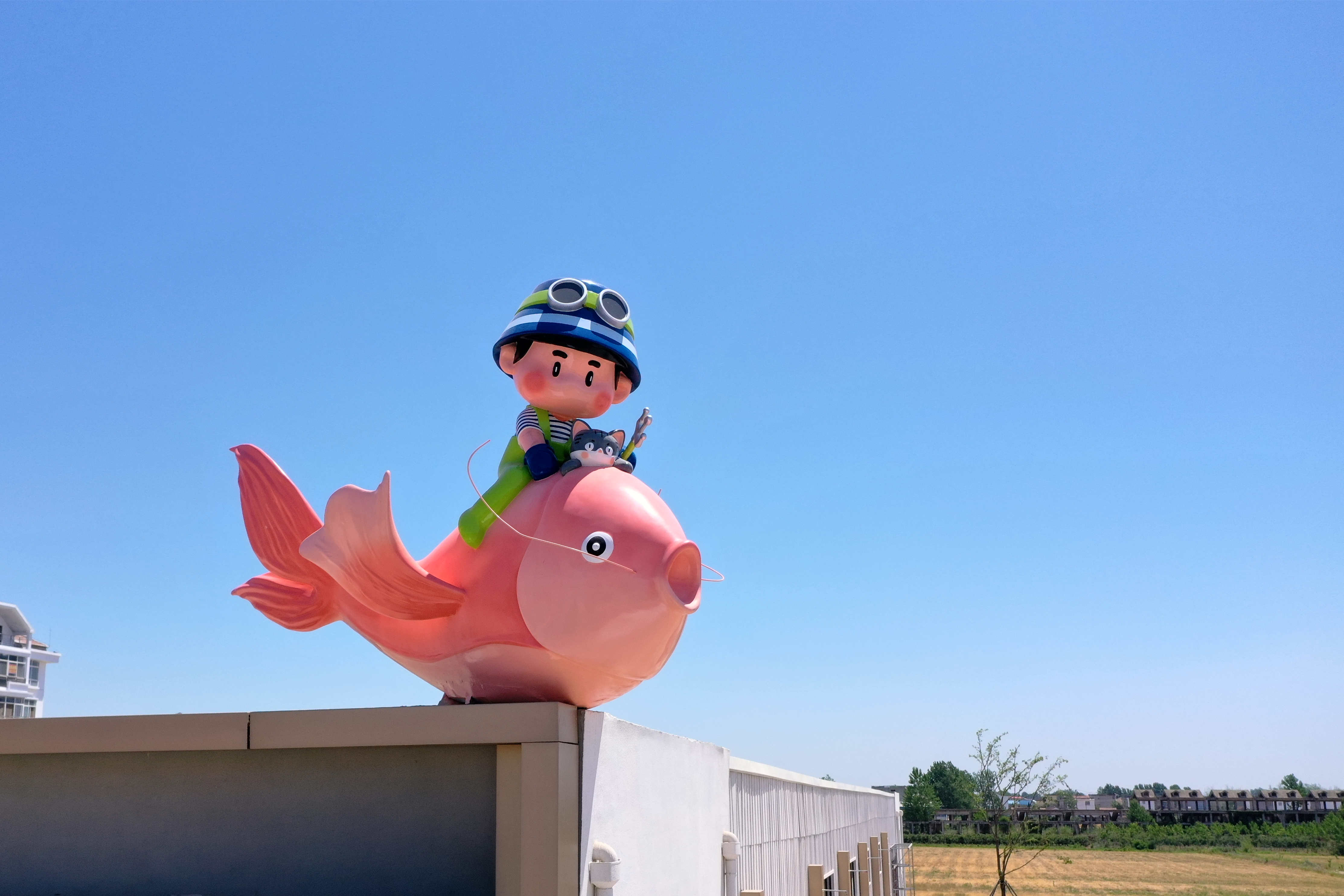 在石梁鲜街,石小海骑着粉色大鱼自欢墩美食城顶端瞭望,特色餐饮店里的鱼肴散发浓香,雕塑装点下的大鱼海Town广场生机蓬勃,巨幅彩色主题彩绘上,喵小良陪着石小海乘风破浪,阳光洒下,彩绘的大鱼仿佛闪着粼光。
