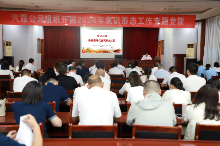 为深入学习党的二十大精神,贯彻落实习近平总书记关于意识形态工作的重要论述,进一步压紧压实意识形态工作责任,推动意识形态工作责任落实落地落细。7月1日上午,汽服公司召开2024年度意识形态专题党课。党课由汽服公司党委书记、总经理鞠仕亮主讲,公司领导班子成员、全体党员及积极分子共70余人参加。