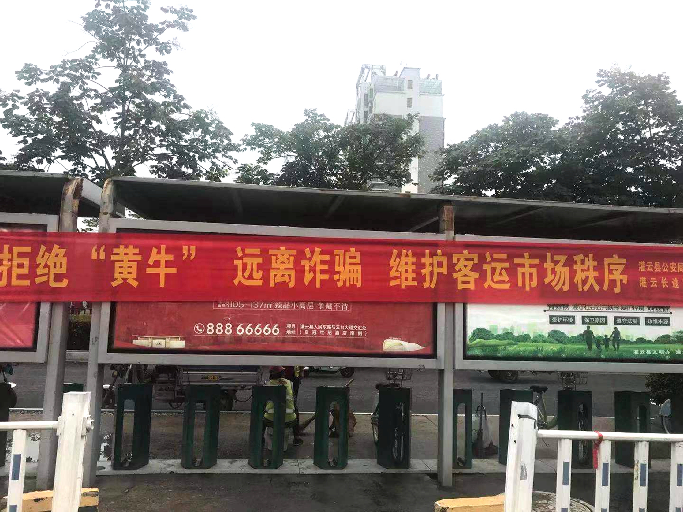 灌云汽车客运站在候车大厅等主要场所悬挂了“拒绝黄牛 远离诈骗”“严厉打击非法营运车辆、非法组客人员”等横幅,营造了良好的“打击”氛围,并开展了安全乘车知识宣传。