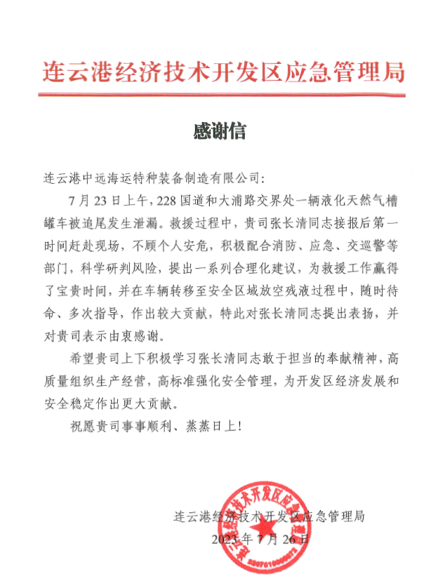 近日,市开发区应急管理局代表到市交通控股江南app最新版下载,江南(中国)权属物流江南app最新版下载,江南(中国)合资的中远海运特种装备制造有限公司,将一封感谢信送交公司副总经理张长清手中,感谢张长清积极配合消防、应急、交巡警等部门处理228国道和大浦路交界处发生的液化天然气槽罐车被追尾泄露事故。号召公司上下积极学习张长清敢于担当的奉献精神,高质量组织生产经营,高标准强化安全管理,为市开发区经济发展和安全稳定作出更大贡献。