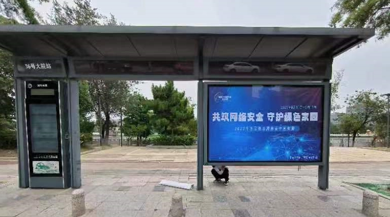 在万达广场、市政府、苍梧路等人流量较大地段的50个公交站亭设置了LED宣传语条屏