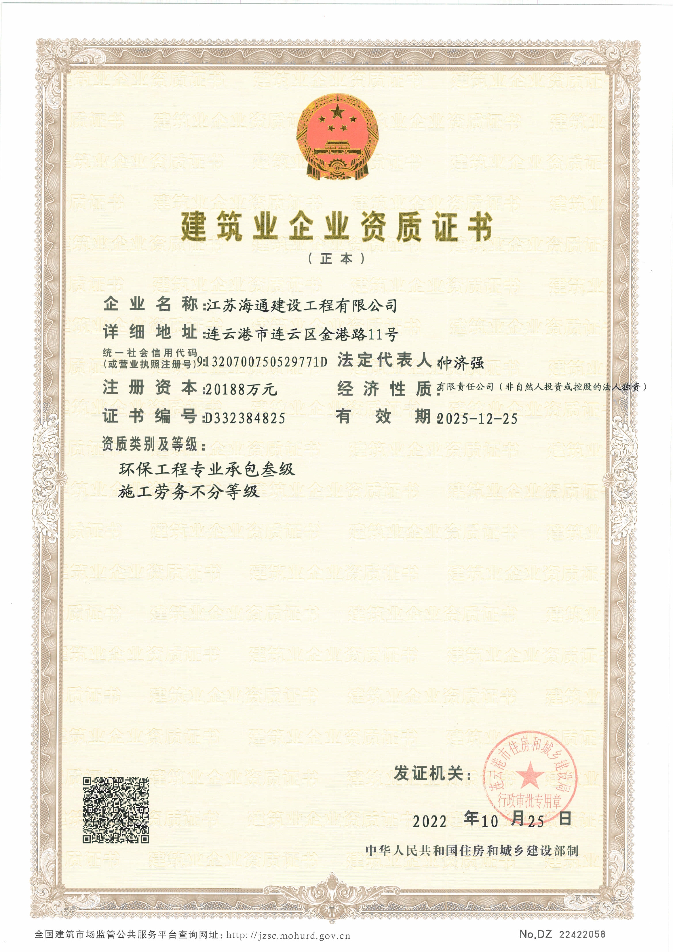 近日江苏海建公司资质申报工作再传喜讯,经连云港市住房和城乡建设局严格审核后批准通过,海建公司成功增项施工劳务分包不分等级”资质