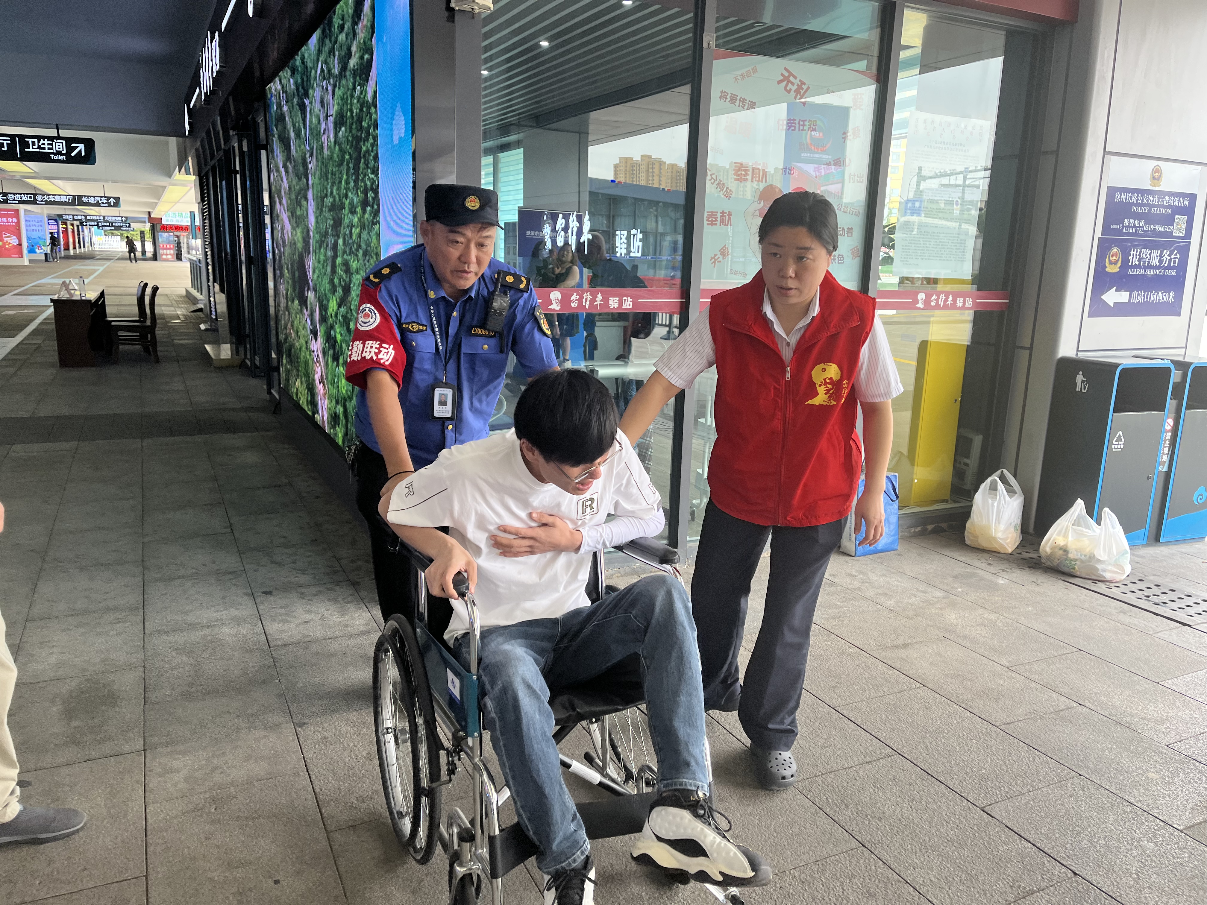 9月15日12时40分,连云港高铁站“雷锋车”驿站的吕红和朱敏在站场正在为往来旅客服务的过程中,发现一位出站旅客面色苍白,独自坐在墙角。她们环顾四周并未发现同行的亲友,便上前询问情况,此时乘客已经无法言语,四肢瘫软无力。吕红参加过一些急救常识的培训,懂得一些急救知识,她第一时间意识到,如果不及时采取措施的话,这名乘客会有生命危险。情况紧急,吕红立即从驿站推出轮椅,将乘客扶上轮椅,并拨打120求救。