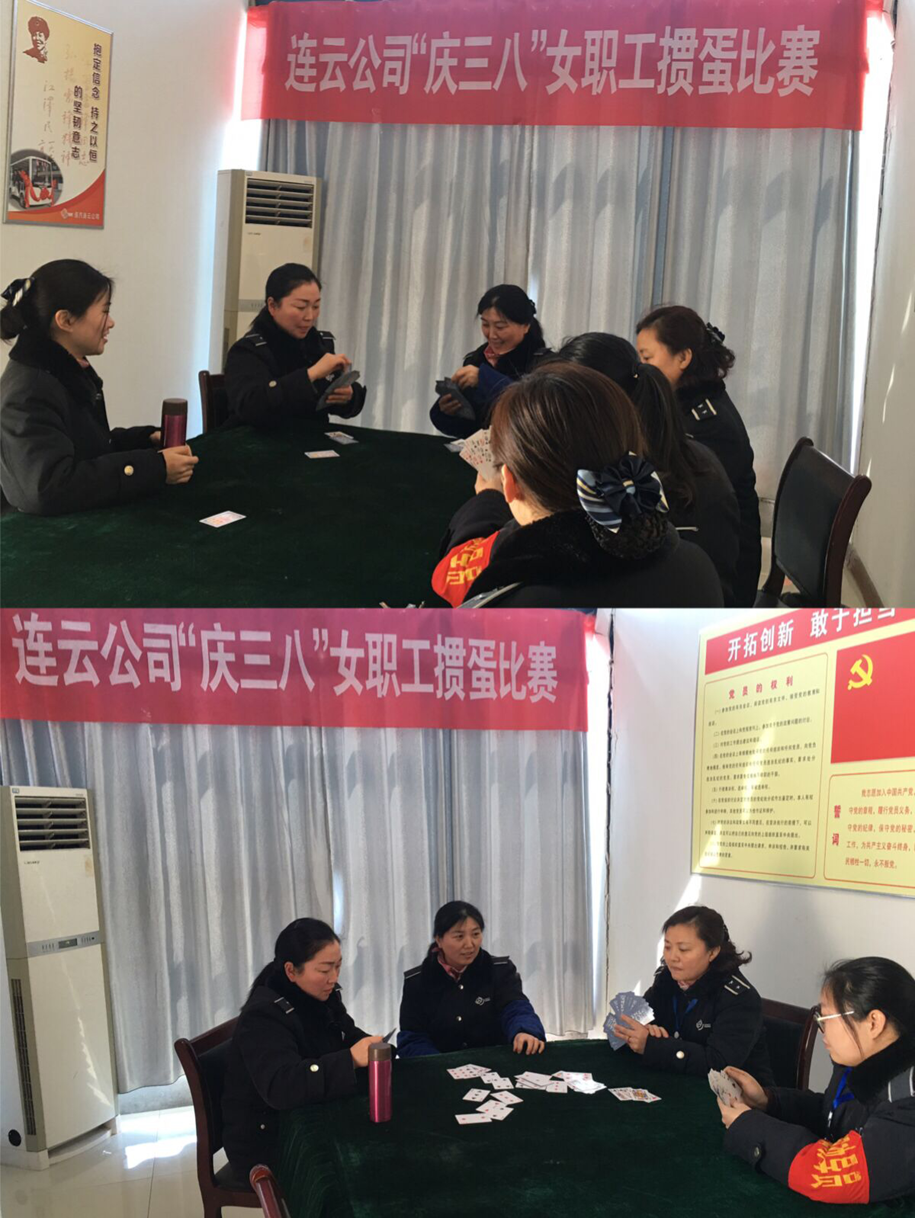 为庆祝“三八”国际劳动妇女节,丰富女职工的文化生活,让忙碌在一线的“半边天”在工作之余身心得到放松。3月8日下午,连云公司工会在会议室举办了“庆三八”女职工掼蛋比赛。比赛现场,大家本着“友谊第一、比赛第二”的精神,认真仔细出牌,互相切磋牌技,紧张激烈又趣味横生,现场热闹非凡,气氛活跃,充分展现了女职工团结一致、积极进取、健康向上的精神风貌,经过奋力拼搏,共有3组6名选手,分获一、二、三等奖,公司工会为获奖选手送上了精美纪念品。通过此次比赛,女职工身心得到愉悦,增进了彼此间的友情,增强了团队意识,营造良好的企业文化氛围。