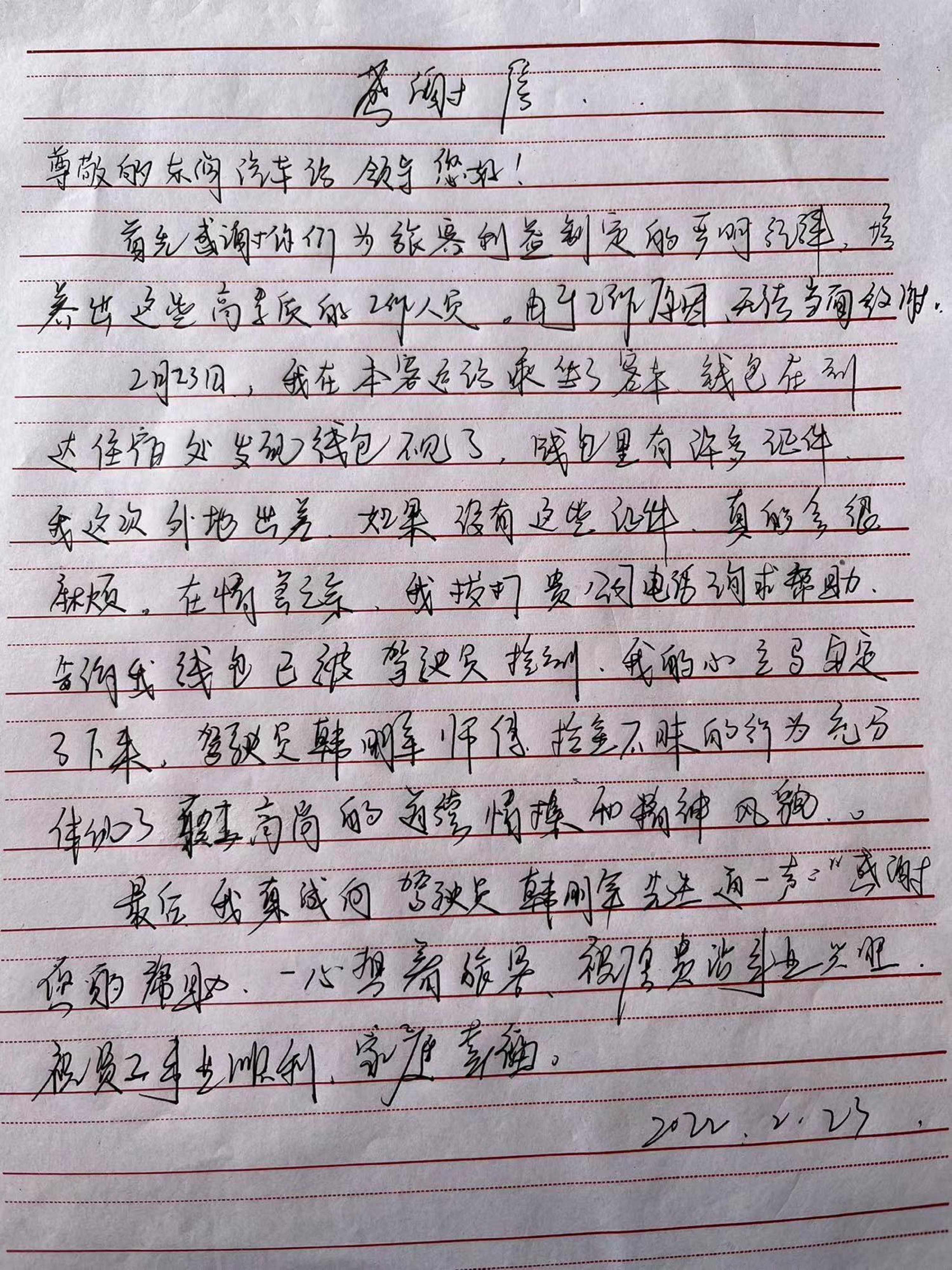 2月24日上午,连汽东海公司值班室收到一封乘客送来的亲笔感谢信,信中张先生对驾驶员韩明军以及东海公司员工拾金不昧和贴心服务表示感谢。表明由于工作原因无法当面致谢,只能通过亲手写封感谢信的方式来表达自己的感激之情。