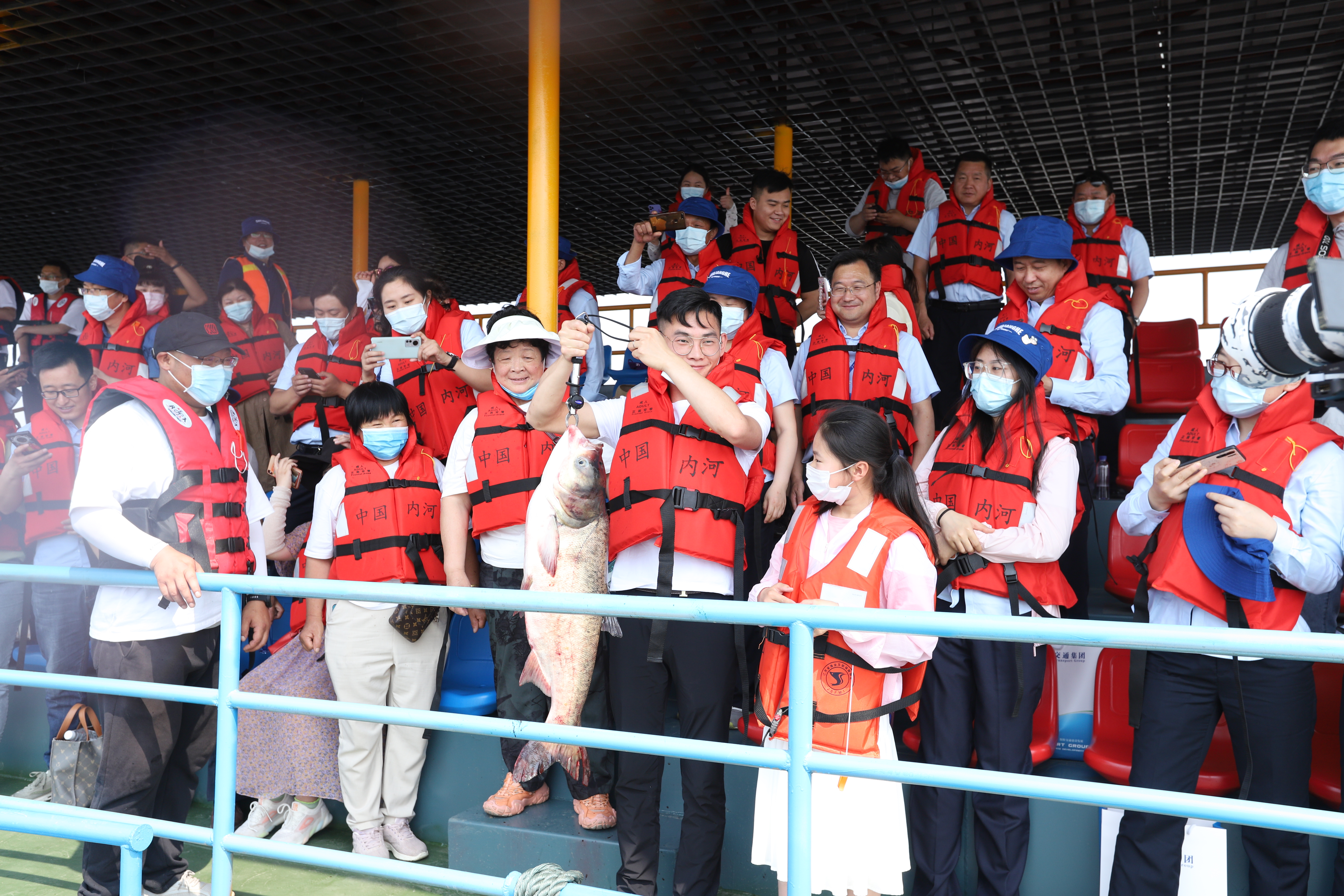 在10艘机船、4艘活水船、8艘手划船的默契配合下,起鱼环节正式开启。统一着装的近40位“捕鱼达人”整齐划一地站在活水船上,随着队长的口令,喊着嘹亮的号子,使着强劲的力量,一下一下地拉动收紧张网。十秒、三十秒、五十秒……约一分钟后,零星的生态鱼相继跃出水面,几秒后,数不清的生态鱼齐跃,现场观众不禁站起惊呼,通过直播方式远程观看的主会场观众掌声四起,这持续了数分钟的震撼画面掀起了石梁河水库清水进城启动仪式的高潮。