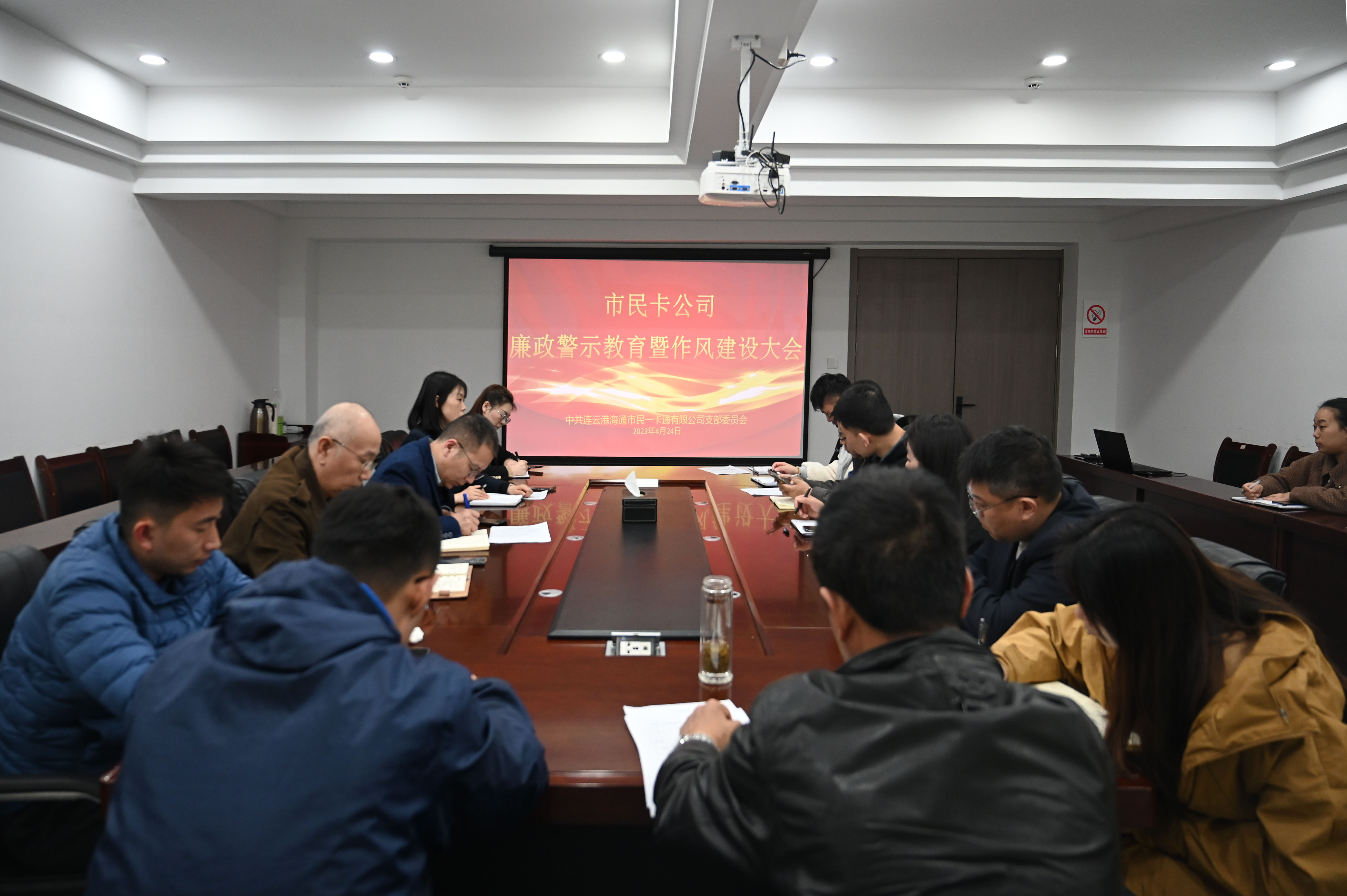 4月24日下午,市民卡公司党支部组织召开廉政警示教育暨作风建设大会,陈琛、叶星妍等领导班子成员、中层干部、全体党员参加会议。