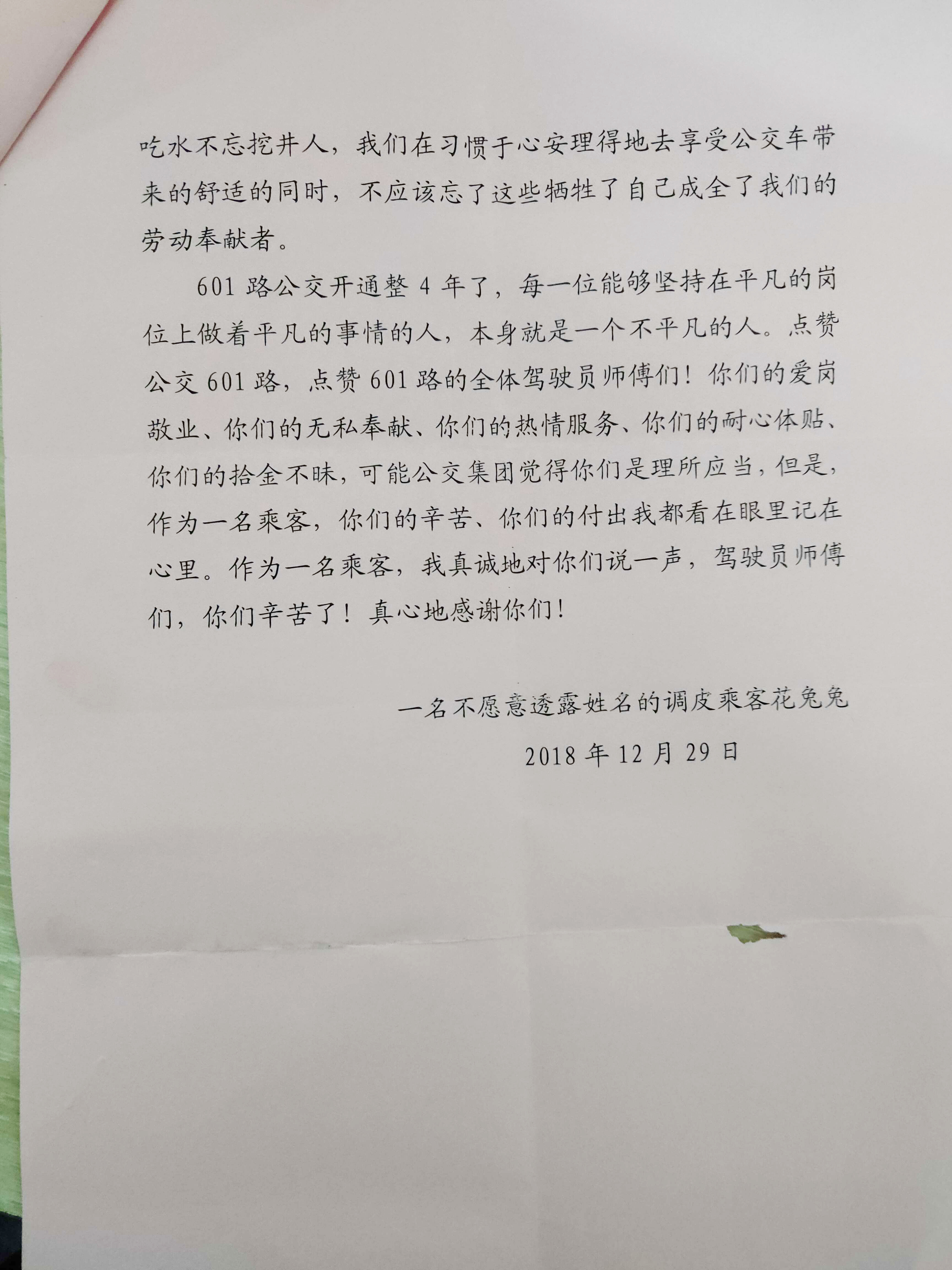 感谢信中提到:601路带给老百姓的诸多实惠当中,作者最要感谢的就是601全线上的所有驾驶员师傅们。是他们的早出晚归、寒来暑往、不辞辛苦才换来了老百姓的便利出行。从2015年正式开通601路以来,每一位驾驶员都是兢兢业业地奋斗在工作岗位上,披星而出,戴月而归,甚至于节假日都坚守在岗位上!乘客们再享受公交车带来的便利、舒适的同时,打从心底里感激这些任劳任怨的驾驶员们!