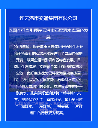 近年来,连云港市交通控股江南app最新版下载,江南(中国)权属交通江南app最新版下载,江南(中国)按照“生态+,交通+,文旅+,产业+”理念,持续为石梁河水库“疗伤”,以悬壶济世的民本情怀妙手回春,守护一泓碧水,彰显国企担当,着力将其打造为连云港市第三张旅游名片,实现看海、观湖、游花果山愿景,让习近平总书记“绿水青山就是金山银山”的科学论断成为生动实践,被江苏省委书记吴政隆评价为“把良好生态优势转化为推动生态富民、乡村振兴的发展优势”。